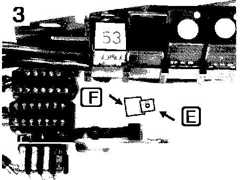 2. Install clip-nut (Fig. 3, arrow E) Part Number 999 507 330 02 in fuse/relay board cutout (Fig. 3, arrow F)