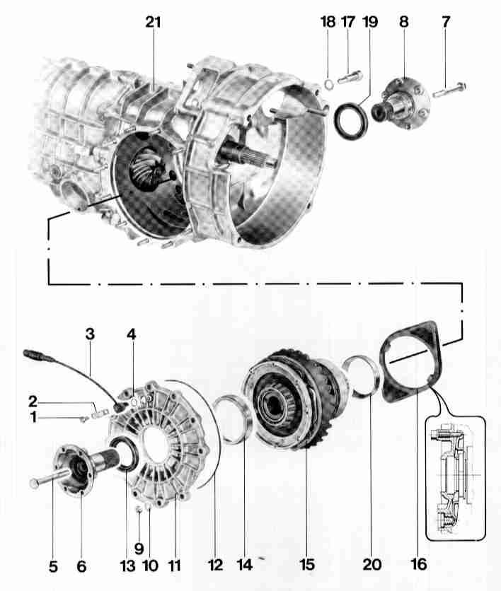NOTE: Before removing the limited-slip differential, always check the amount of wear at the plates. If plates are re-used after a period of operation, the position of the counter-bearing (No. 1) must not be altered. If repositioning or removal of the counter-bearing is unavoidable (for instance to rectify a leak), always measure the installed position of the counter-bearing before removing it, so that it can be installed again in the same position.