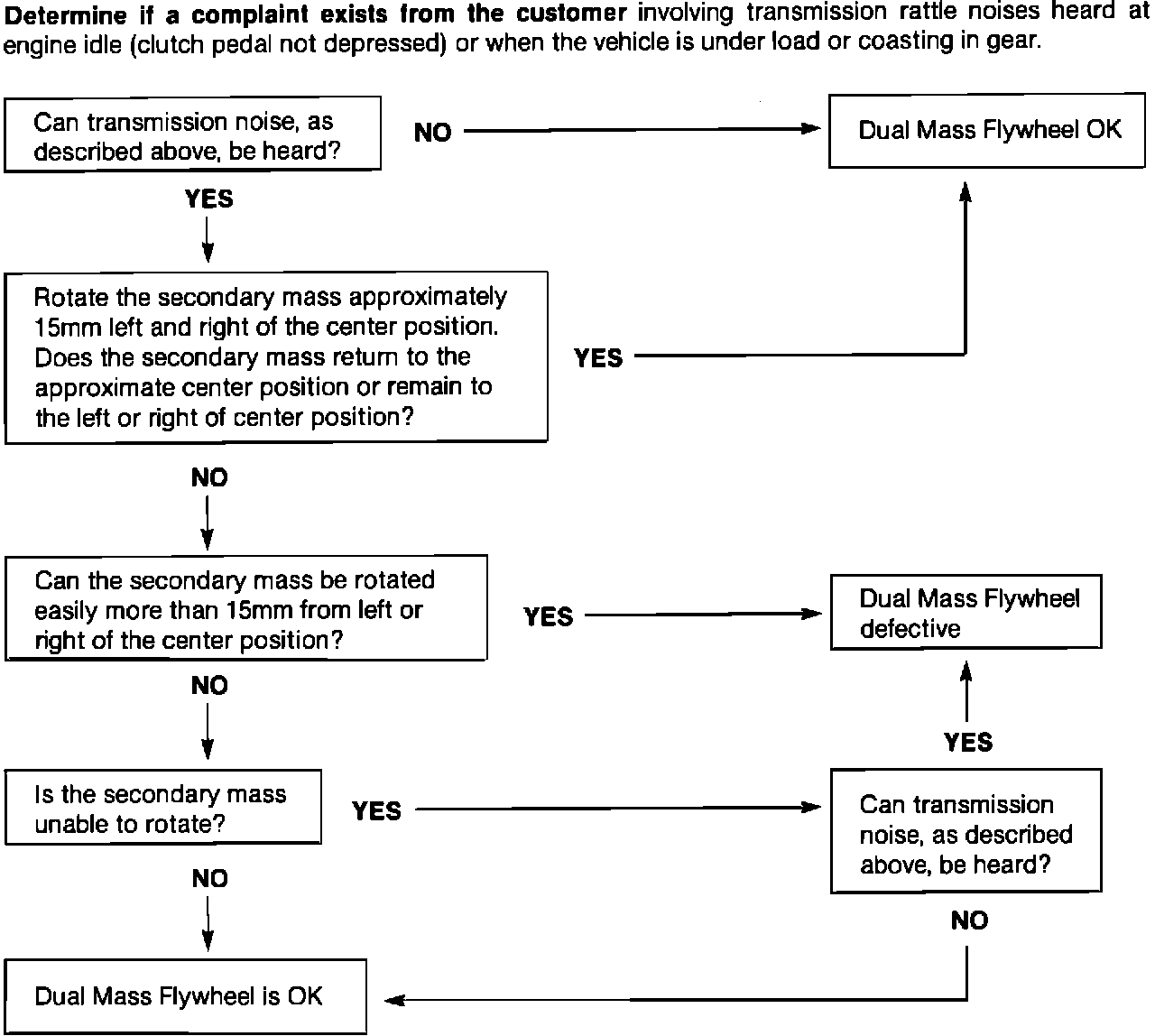 The checking procedure for the Dual Mass Flywheel found in the Workshop Manual, Vol. 1, page 13-38d, point 3, and Technical Bulletin Group 1, Number 9203 (dated 3-17-92) no longer applies. When diagnosing complaints involving the clutch system /Dual Mass Flywheel, proceed as follows: