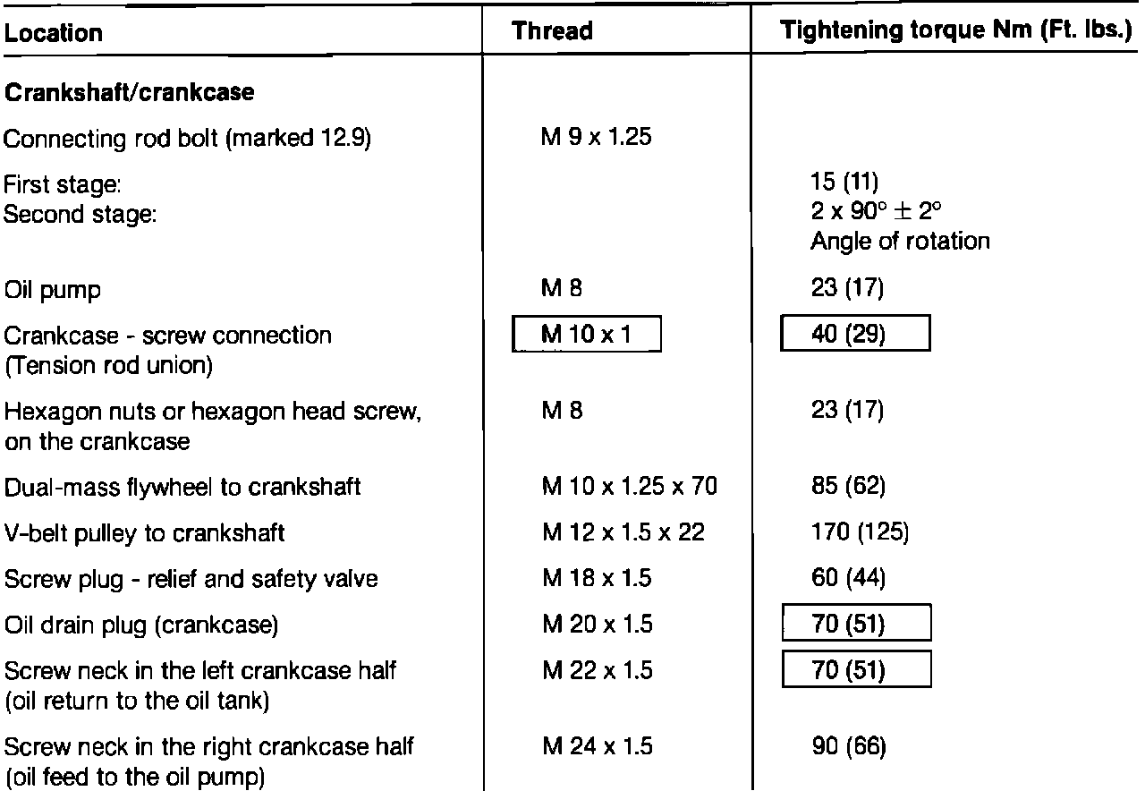 The engine tightening torque and thread size for the crankcase screw connection and the tightening torque for the screw neck in the left crankcase half (oil return to the oil tank) given on page 10-1 of Volume 1, 911 Turbo '91 Workshop Manual are incorrect. Please note the following corrections (shaded areas) and write them into the Workshop Manual where necessary.