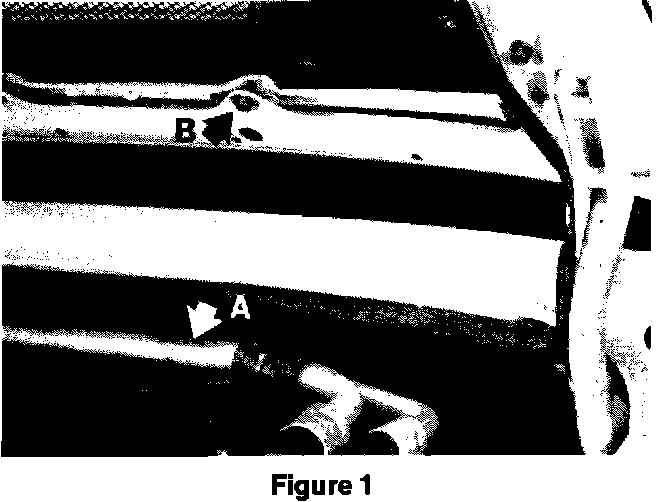 Concern: Rear spoiler mounting bolt (B) contacts A/C line (A) in engine compartment (arrows in Figure 1).
