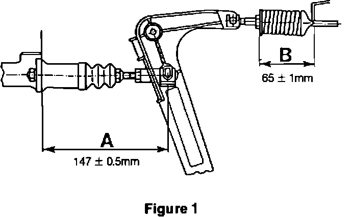 Adjust distance B in Figure 1 to 65 +/- 1 mm. Measure from outside stop washer to bearing with clutch pedal released. Adjustment is made by turning the hex nut.