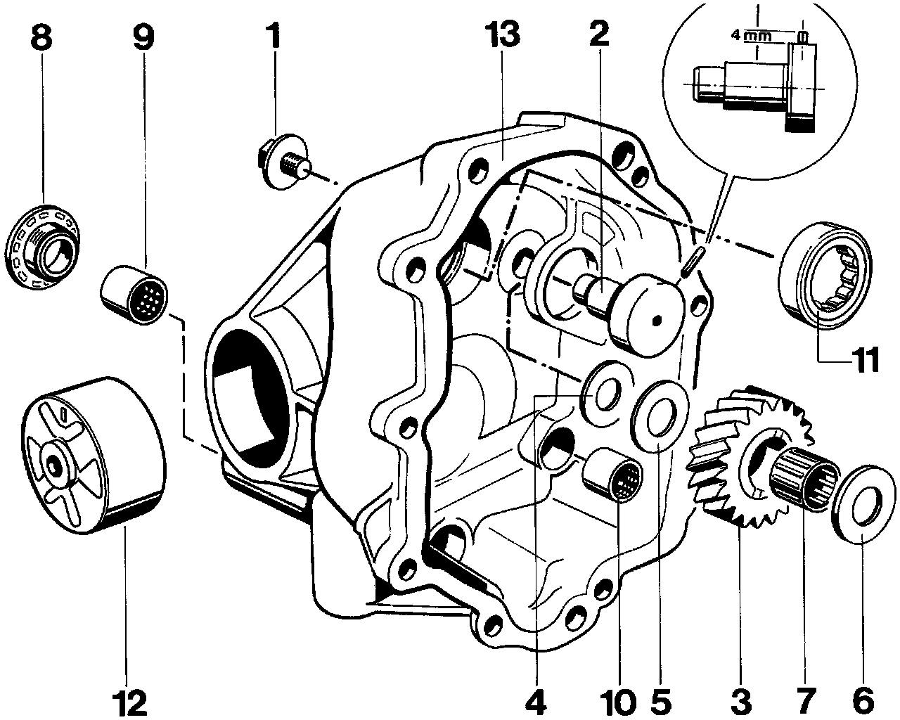 - Reassemble reverse idler gear with thrust washers and bolt in correct position (refer to exploded view). With thrust washers and bolt located correctly, the axial end play of the reverse idler gear is 0.15 to 0.35 mm.