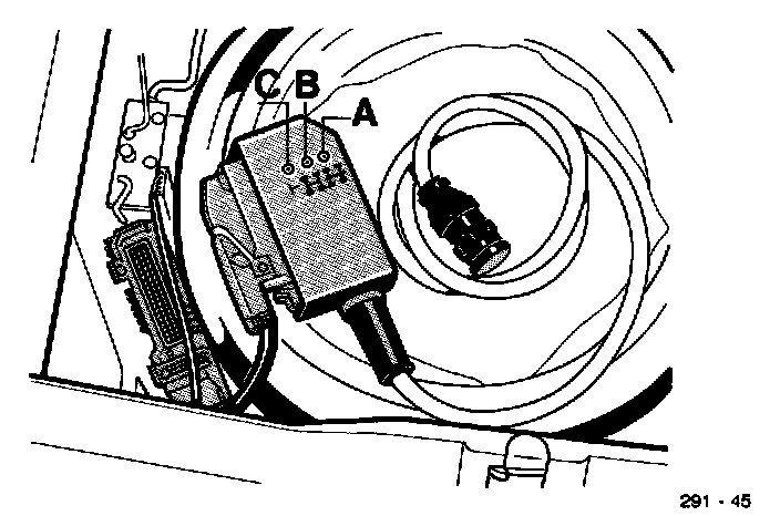 3. Connect the plug to the sensor. Check the installed position of the sensor and its function by testing the output signal. To make this check, connect the 55-pin ABS 2-LED adapter wire to the control unit plug. Connect the multimeter to sockets B and C.