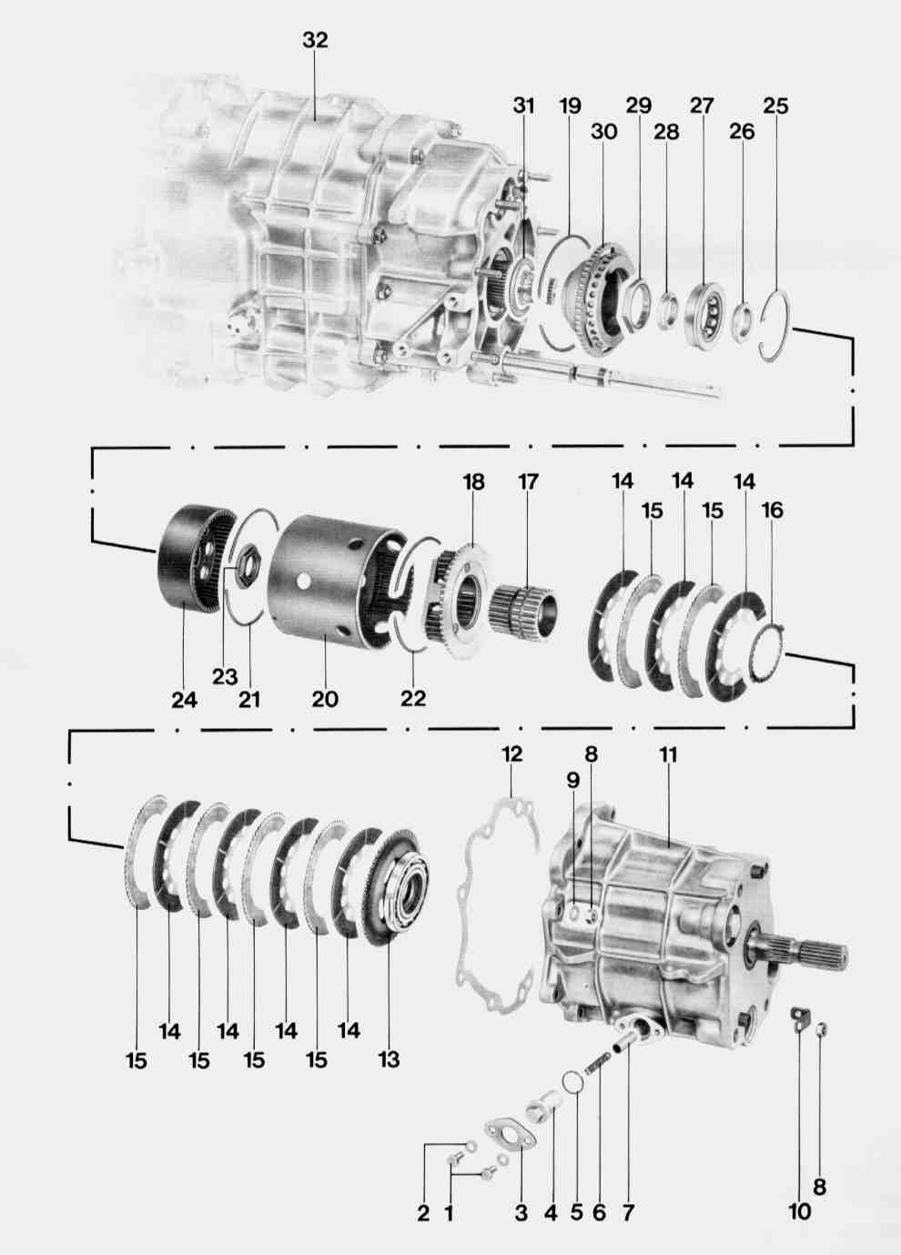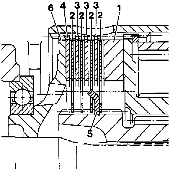 NOTE: Due to the fact that supply of the Gylon inner discs is stopped, the longitudinal lock must be fitted with Valeo friction discs if repairs are required. To do so, replace all friction discs as well as the wave disc and adjust the pack thickness to the specified dimension (26 mm). Combining Gylon and Valeo inner discs is not permissible.