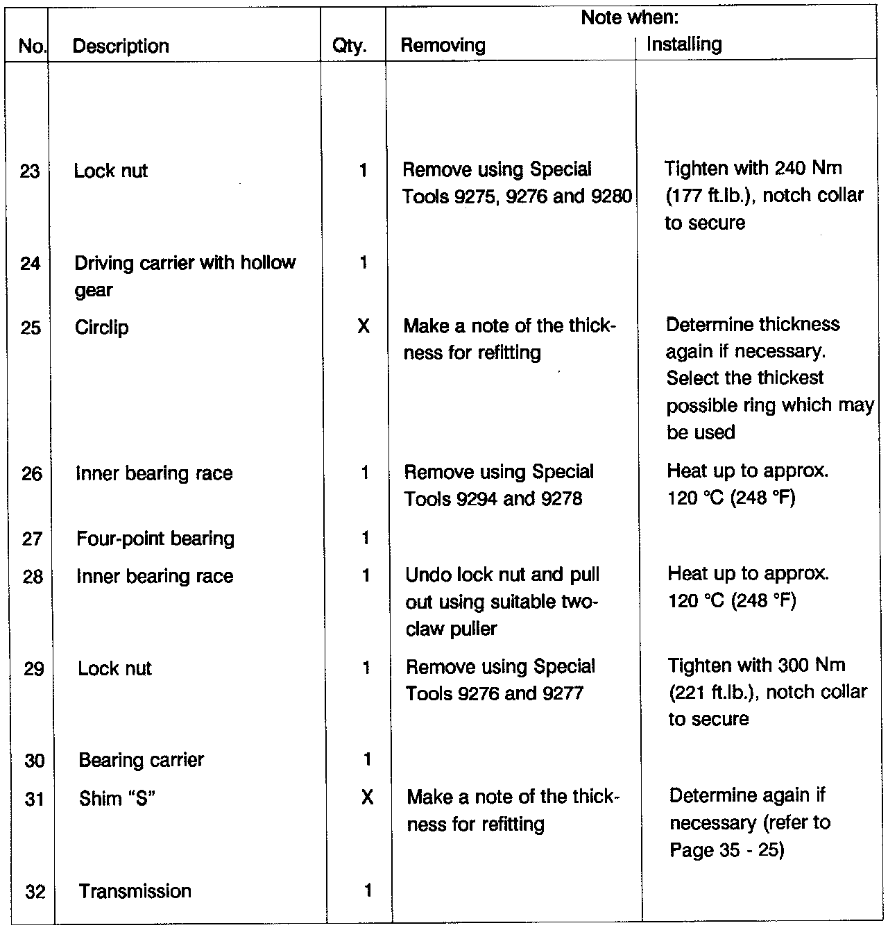 - Remove inner bearing race (No. 26) with Special Tools 9278 and 9294.