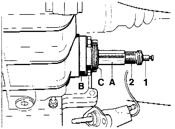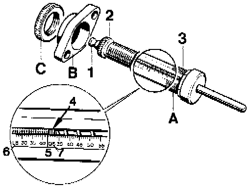 2a. Measure transverse lock. Fit the measuring cylinder (A) with flange (B) on the transmission. Align the measuring cylinder so that the measurement scale is easily visible. Tighten the flange securing nut (C).