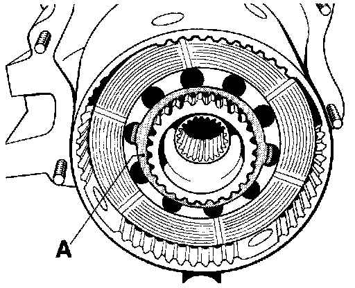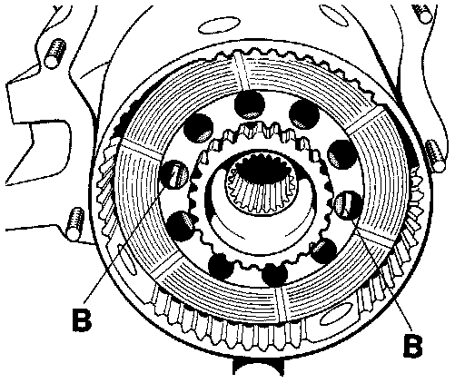 - Insert tab washer (A) between 3rd and 4th inner plate so that the lugs (B) project through two oil holes in the carrier plate.