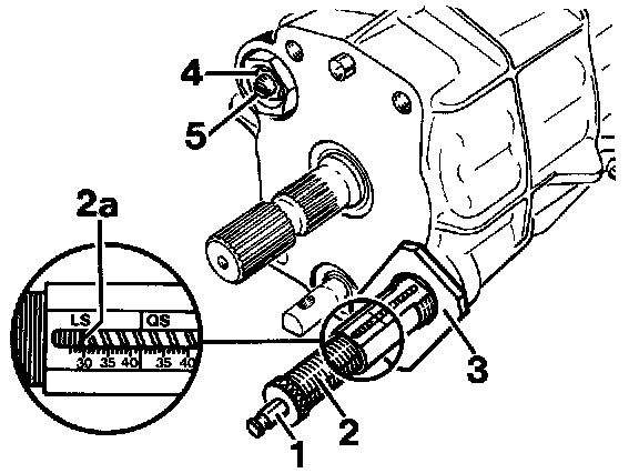 4. Use the adjusting screw to set the measuring cylinder to 29.5 mm (in the front-rear differential lock measuring range). LS = Front-rear diff. lock measuring range OS = Lateral diff. lock measuring range