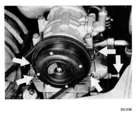 Disassemble the air-conditioning compressor from the console and, with lines still connected, lay it on the adequately protected left-hand rear fender.
