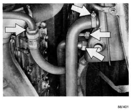 CAUTION: Do not trap the heating hoses, slide onto the heat exchanger just before the engine/gearbox assembly is in the correct installation position.