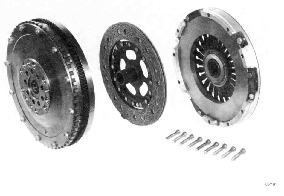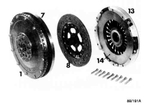 Starter gear ring (3) is also mounted on the primary flywheel. Housing (13) for the pressure plate is made of light alloy metal, while pressure plate (14) is a gray cast iron product. Housing and pressure plate belong to the secondary mass.
