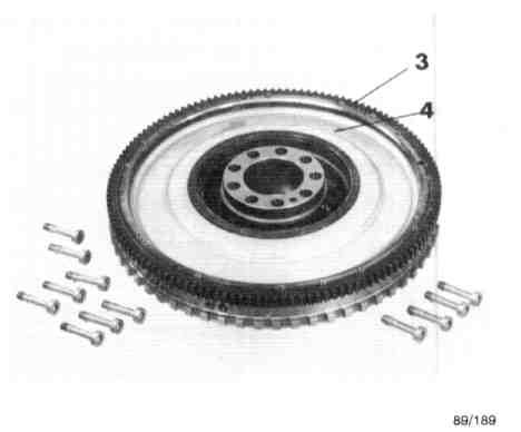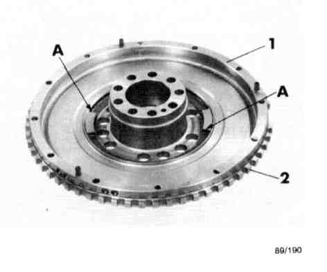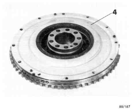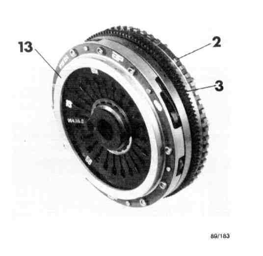 The double mass flywheel system is mounted direct on the crankshaft. The primary mass, with positive connection on the flywheel, consists of primary flywheel (1), which is fitted with gear ring (2) for the ignition's reference mark sender.