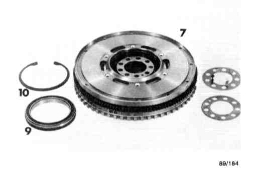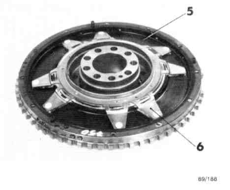 The outside of secondary mass (7) bolted on the inner race of the rubber damper is the bearing surface (engine end) for clutch disc (8). Ball bearing (9), permanently lubricated and sealed on both ends, is applied to the center and guide both flywheel masses to each other. This ball bearing can be replaced after removal of circlip (10).
