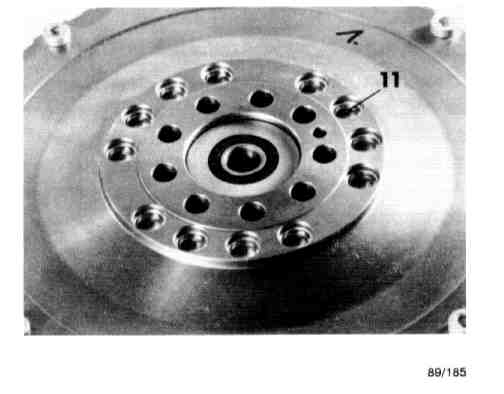 If a double mass flywheel has to be disassembled, plugs (11) must be removed first. Twelve bolts (12) will then be visible underneath, which are used to bolt rubber damper (5) on the secondary mass.