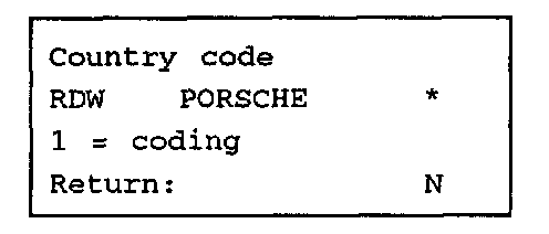 The Country code menu displays the coded version in the top left corner, e.g. RoW. The center displays Porsche or Workshop, depending on where the system has been coded. The asterisk on the right is displayed for versions that include the interior lights in the alarm emission.
