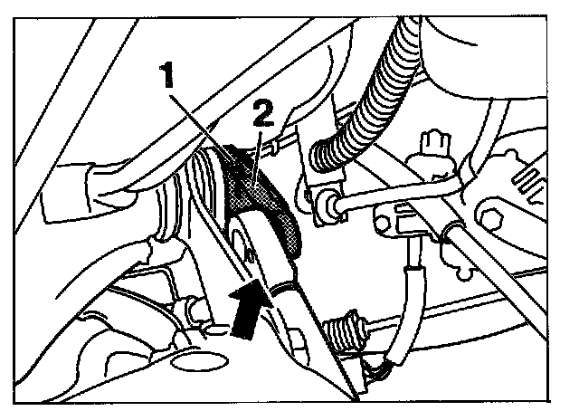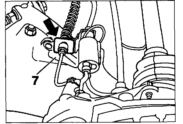 2. Take lock spring (arrow) off brake hose and remove bracket (7) from rear-axle trailing arm.