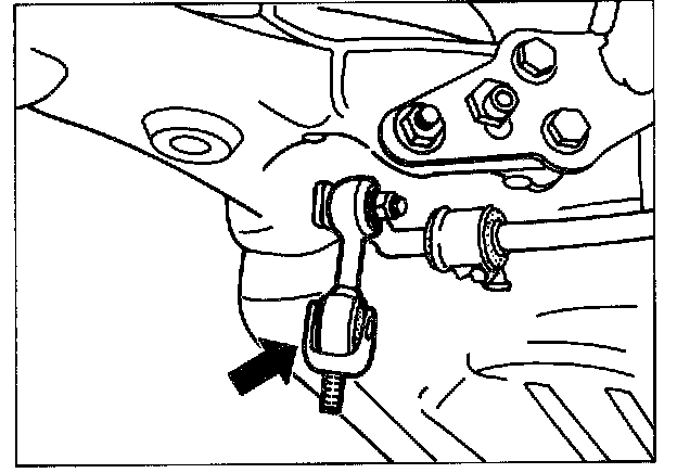 5. Unbolt stabilizer bar mounts (arrow) from stabilizer bar. Raise rear-axle trailing arm somewhat, extend mount and let hang down.