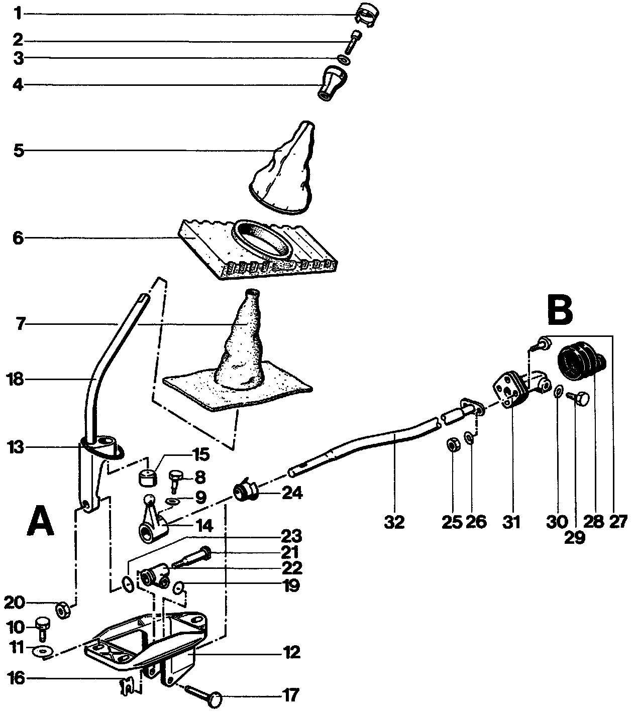 - To remove bearing unit (B), remove tunnel cover in front of rear seat and undo connection to selector rod (2 hex nuts).