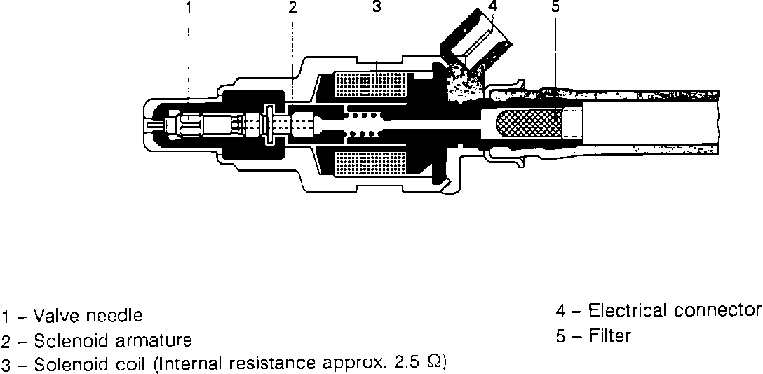 Design and electrical layout is identical to L-Jetronic fuel injector. On fuel inlet side, valve is connected to lower chambers of fuel distributor and is fitted with a connection leading to fuel return line. Control unit feeds frequency valve square pulses of constant frequency (70 Hz.), but of variable pulse width. Pulse width is referred to as pulse-duty factor. Since pulse width is subject to constant changes in control mode, this also indicates system is operative.