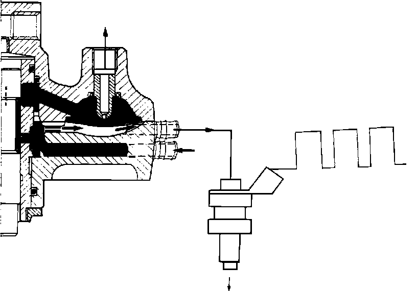 As duration of pulses fed by control unit decreases, frequency valve opens only for a short period. Pressure in lower chamber is only slightly reduced. The diaphragm deflects only slightly, differential pressure diminishes and quantity of fuel injected is reduced.