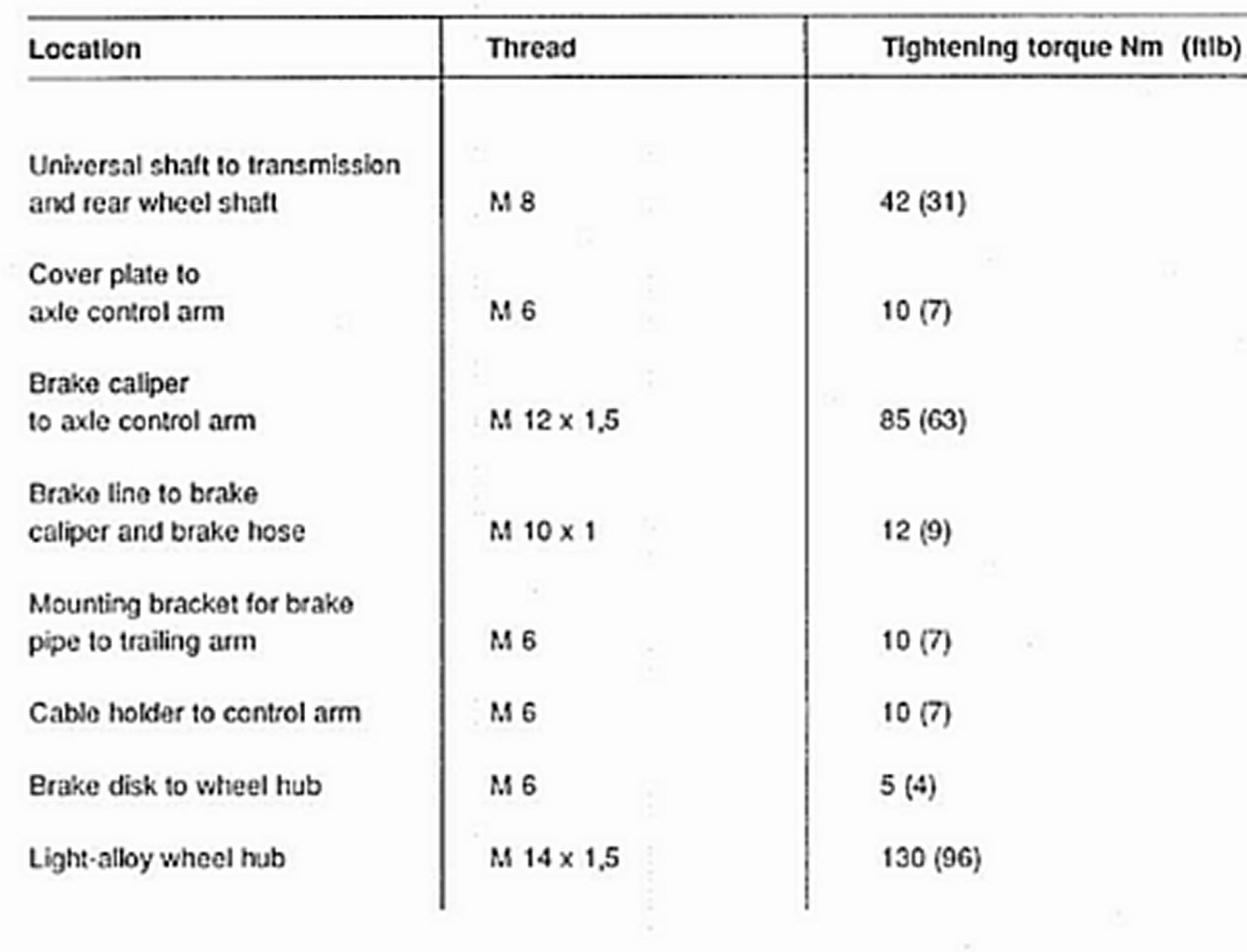 Component tightening torque specifications, rear wheel