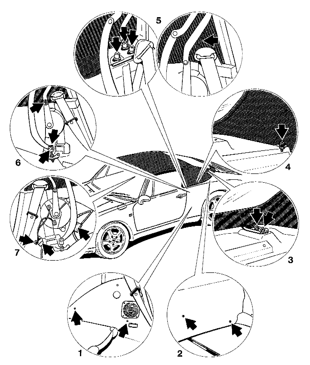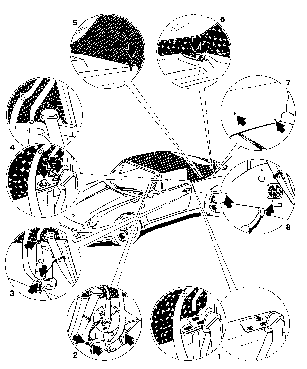 Unscrew the connector for the microswitches from the body. Disconnect the connectors for the microswitches and convertible top locks. Lift convertible top off vehicle.