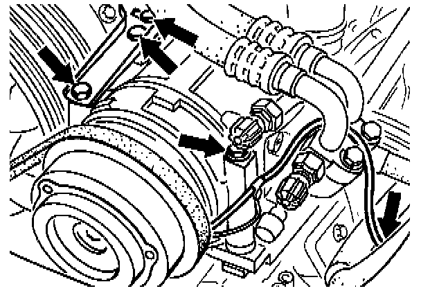 4. Disconnect plugs, remove air conditioning compressor from console and leave it attached to the hoses connected to it. The compressor may be placed on a suitable rigid support on the left-hand side panel.
