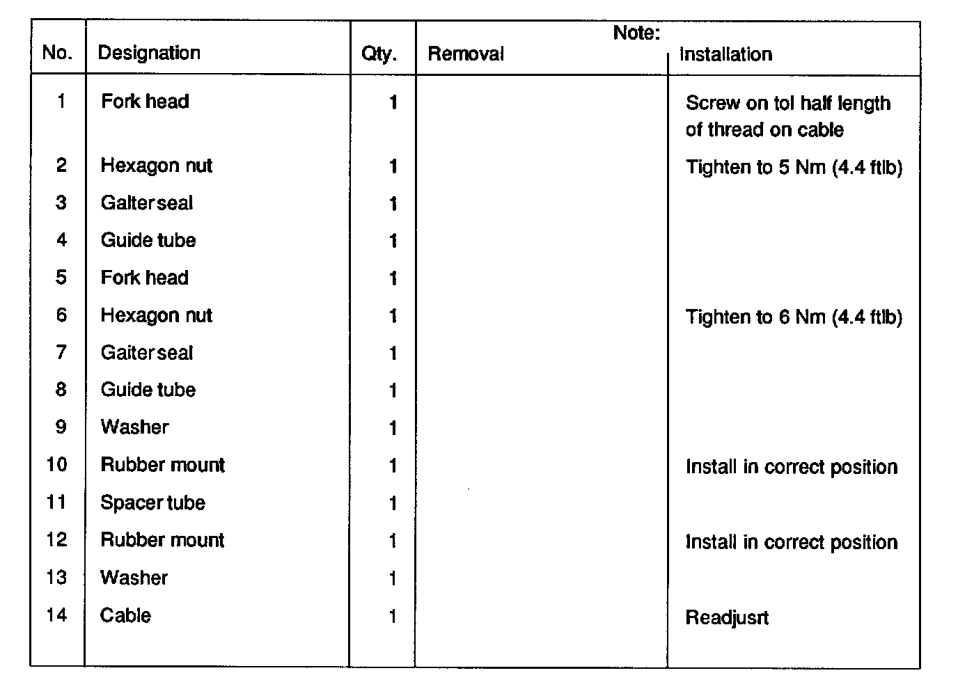 2. Disconnect cable on operating lever and remove fork head.