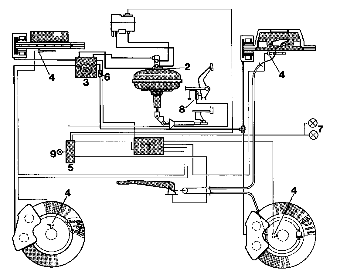 The ABS control unit receives the stop light switch signal and the AC signals supplied by four speed sensors. Two microprocessors then convert these signals independently into corresponding digital wheel speed signals. The wheel speed signals are used to calculate wheel slip (nearly proportional to the calculated vehicle reference speed).