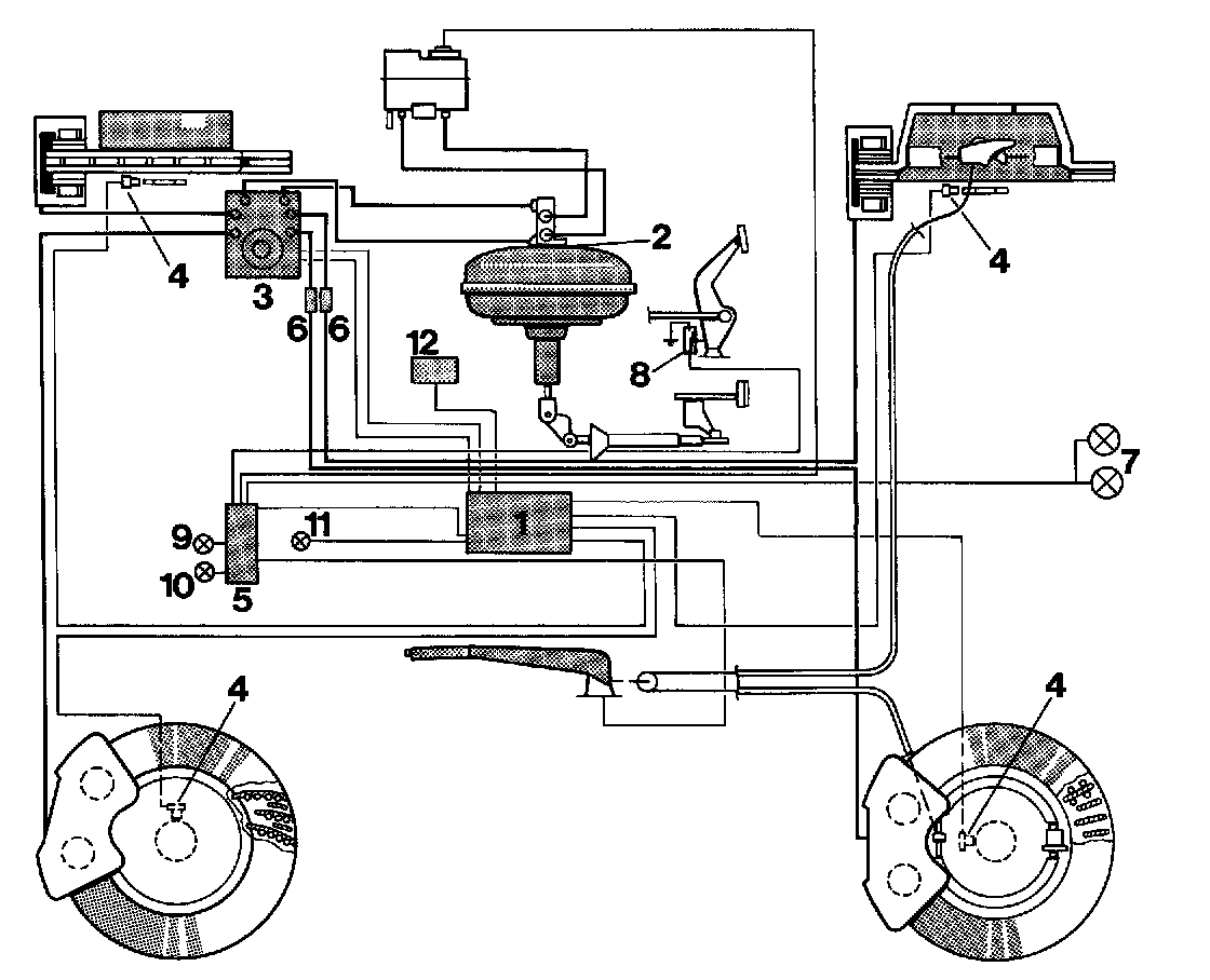 NoteThe ABD (Automatic Brake Differential) complements the ABS system and is used as a traction aid at speeds up to 45 mph. For this purpose, an active input into the brake system is made if one driven wheel starts to spin. Since ABD control has to trigger the driven wheels individually, the ABS/ABD system is designed as a four-channel system. With ABS control of the rear axle, the inlet and outlet solenoid valves of both rear wheels are triggered in parallel (common control as with a ABS 5 3-channel system).