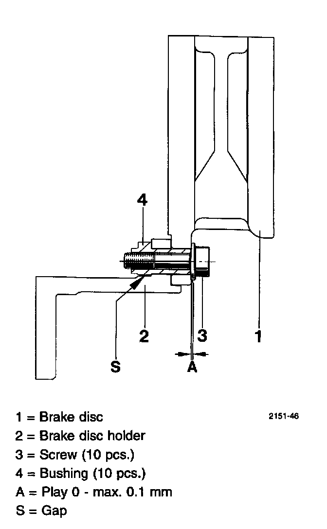 Important: Do not separate brake disc holder and brake disc. Furthermore, turning the screws no.3 (even if they seem to be loose) is neither permitted nor required [for explanation about Tightening, Play (A), and Gap (S) refer to Explanation Pertaining to Two-Piece Brake Disc.]