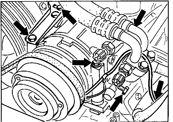 4. Disconnect connector joint, remove A/C compressor from bracket and leave it connected to the hoses.