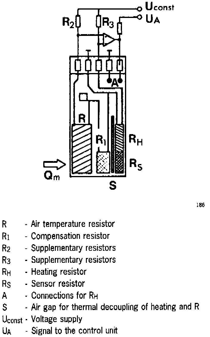 The servo amplifier Rv compares the current flow between the temperature resistor R and the sensor resistor Rs and influences the current flow lH to the heating resistor RH, in order to maintain a constant 16°C/32°F temperature differential between the intake air temperature and the temperature of the heating resistor RH. Regulation of this constant temperature differential is performed within in milliseconds.