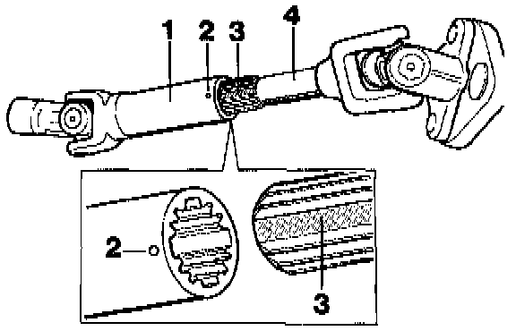 1. If the slider No. 1, has been pulled off the steering shaft No. 4, the roll pin No. 2 must face the tooth cutout (No. 3) when the components are reassembled.