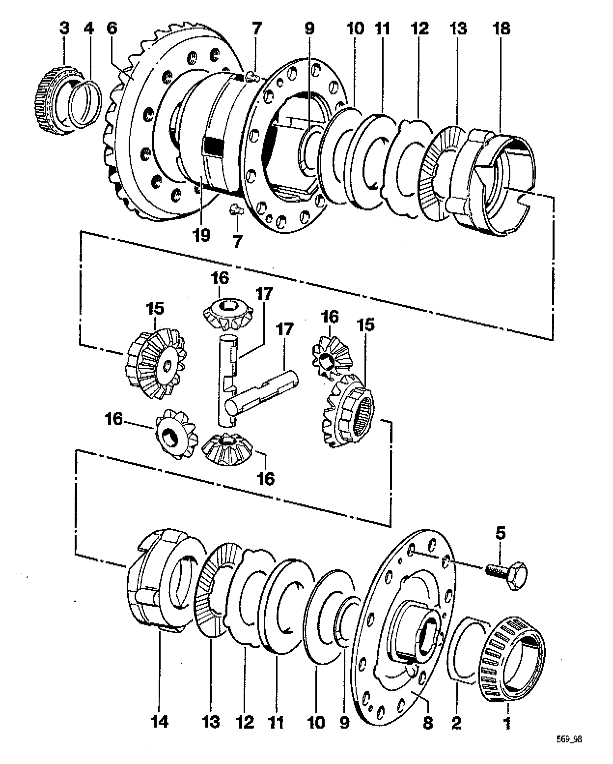1. Lightly oil all surfaces of the discs, thrust rings and axles with transmission oil.