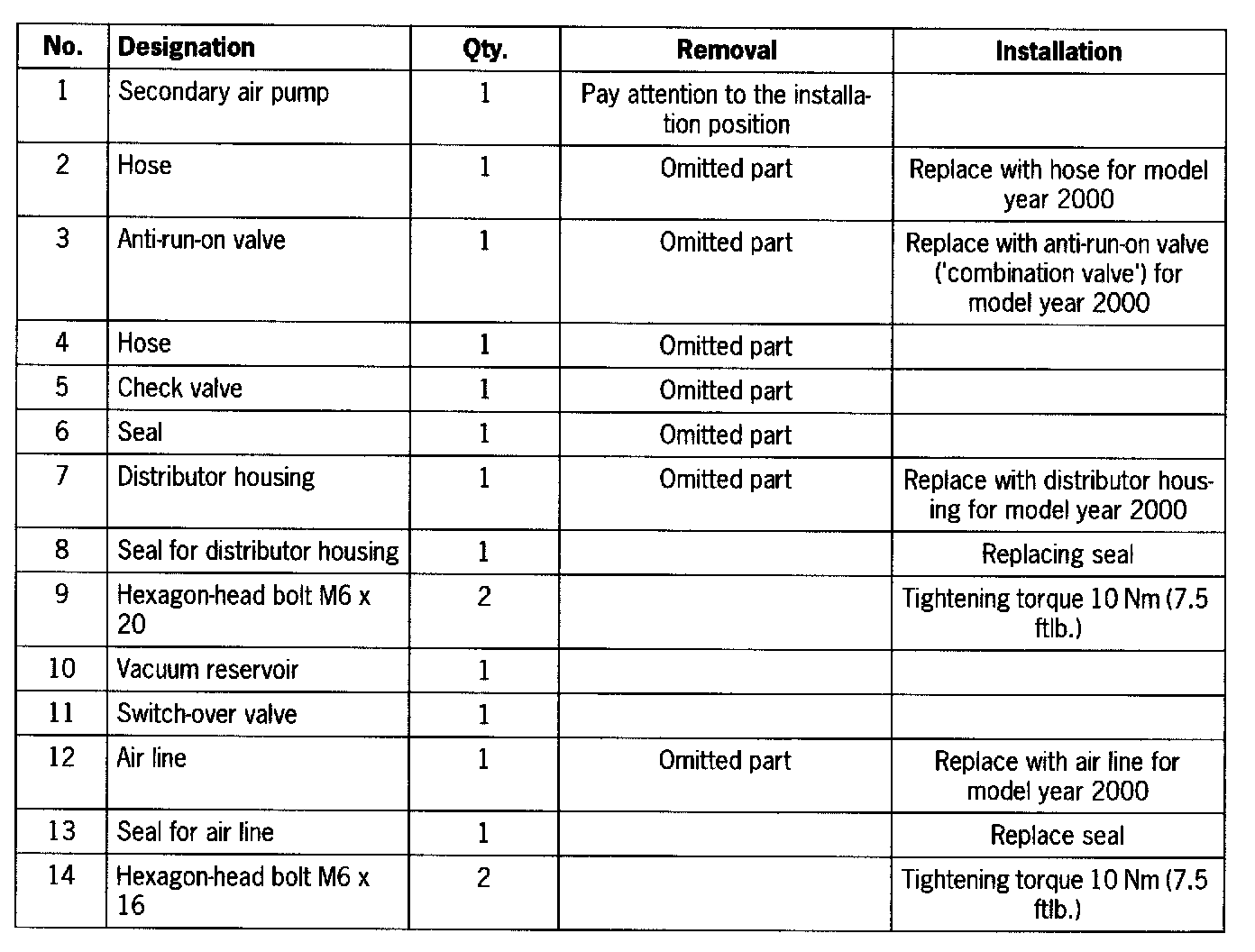 If the anti-run-on valve or the check valve are defective, the secondary air system must be converted to the system used as of model year 2000, see Carrera Technical Information 1/02 2669. A list of new or omitted parts is attached to the aforementioned Technical Information document.