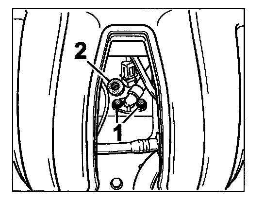 8. Fit new hose to the secondary air pump using a spring-band clamp at the combination valve -2- and connect the vacuum hose -1- to the combination valve.