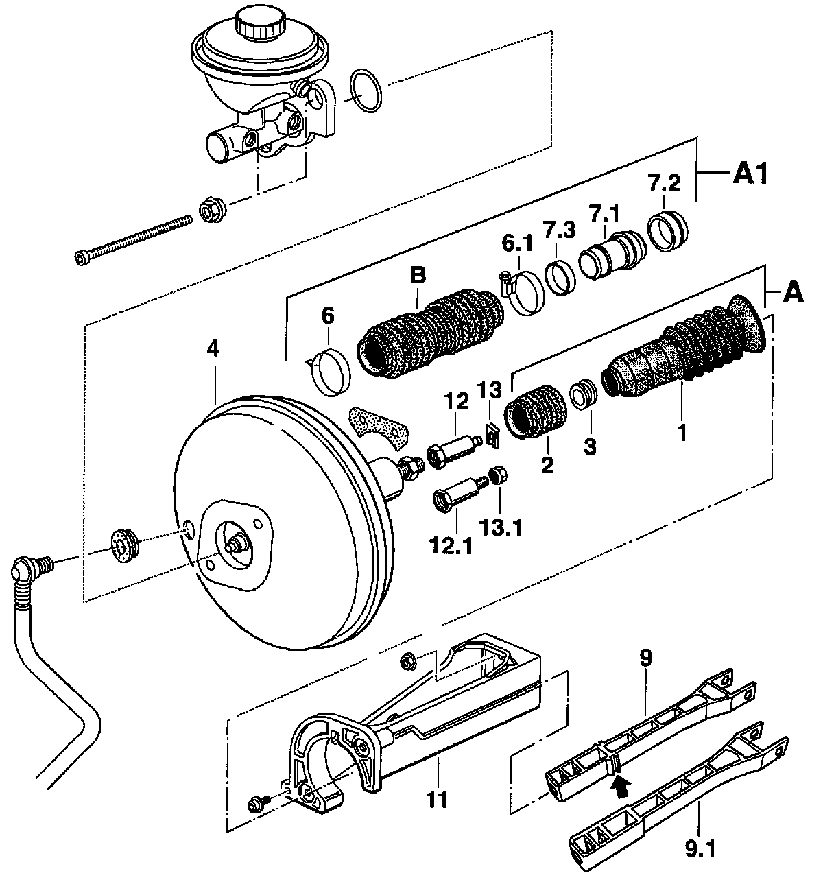 - The parts shown are used in place of the removed parts -1 / 2 / 3-: Bellows -B- (already mounted on new brake boosters), connection sleeve -7.1- with sealing ring -7.3-, the seal for the firewall -7.2- and the hose clamps (clamps) -6 and 6.1-.