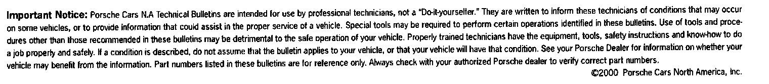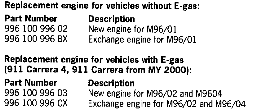 Part numbers of replacement engines have been consolidated to simplify engine ordering. Effective immediately, replacement engines for manual and Tiptronic transmission equipped vehicles is the same part number. All replacement engines for the 911 Carrera are shipped with a Tiptronic version engine harness. On vehicles equipped with a manual transmission, the Tiptronic wiring is not used, and is tied back with tie-wraps (see repair notes).
