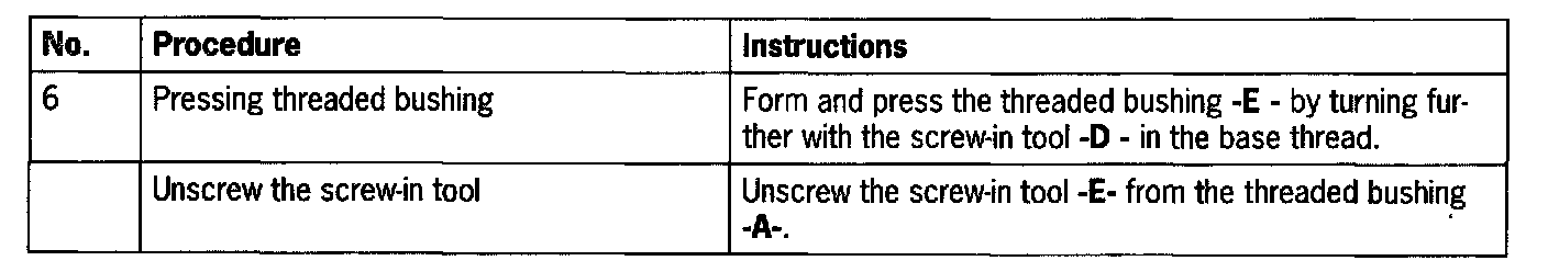 - White pressing in the base threads, a noticeably larger amount of force on the screw-in tool is required to form the inner threads. Pressing is finished when the screw-in tool can be further turned more easily.