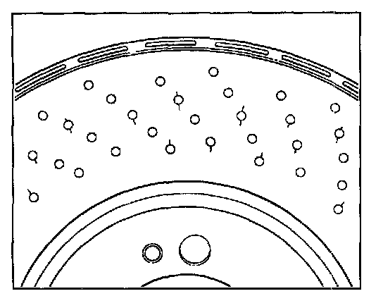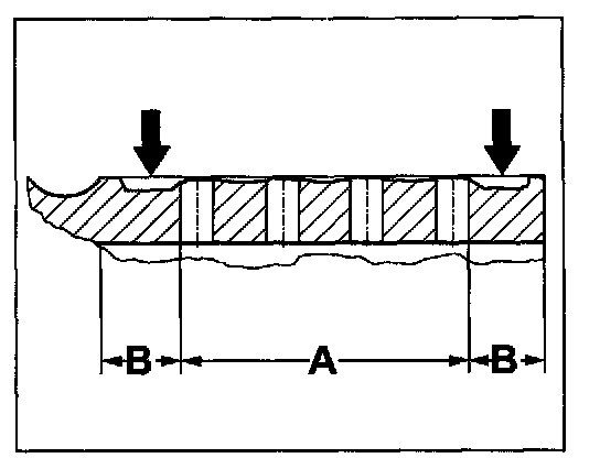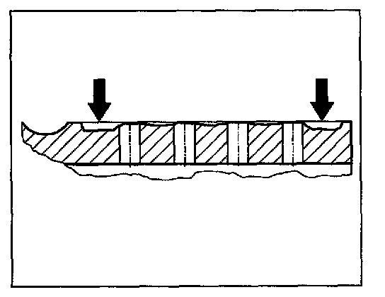 - In the presence of high pressure forces, at the innermost and outermost hole-free friction plate track -arrows-, the brake pad friction surface is the least worn, compared to the middle holed area. As a result, in the case of weaker braking, a relatively higher amount of pressing on the surface arises in these areas and therefore greater wear of the friction plates. The natural balance between stronger and weaker braking ensures that in almost all cases the typical wear profile of a perforated friction plate arises (inner and outer smooth friction rim area) is the most worn -arrows-.