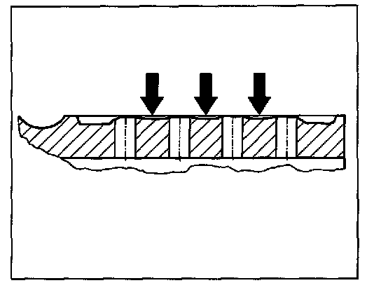 The drawing shows the typical grooved wear profile -3 arrows- of a perforated grey cast iron brake disc, which has been used to the wear limit, under tough conditions i.e. constant operation mode (test operation mode).