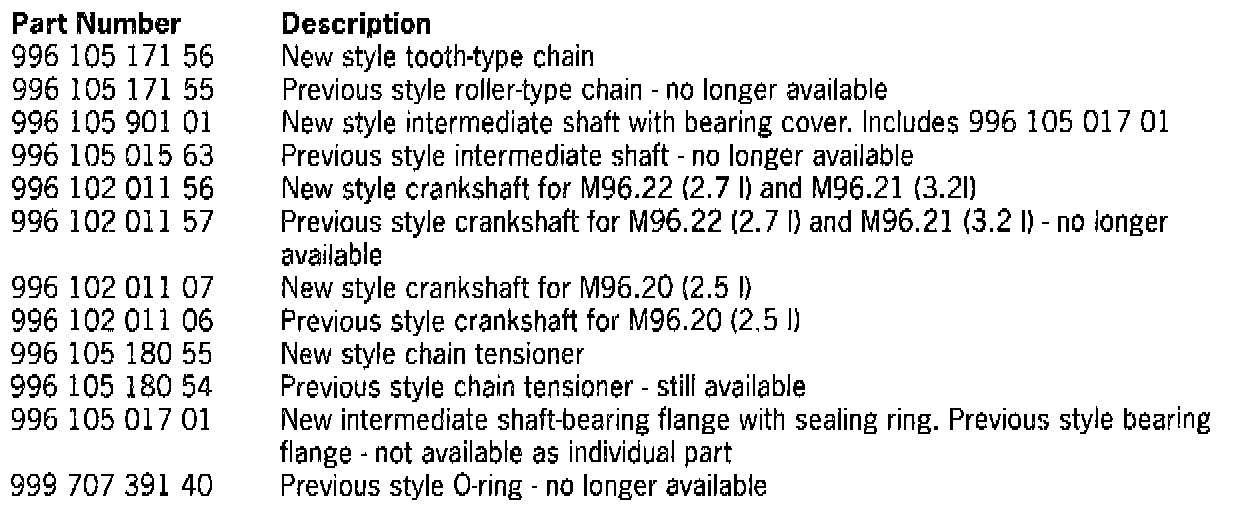 A mixed configuration is not permissible, as the parts are matched with each other. The previous chain tensioner, part No. 996 105 180 54, is still available and may continue to be used on engines that have the previous style drive chain installed.
