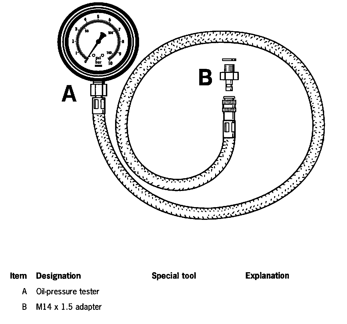 7. Have a second person increase the engine speed to 4000 rpm. Read off the oil pressure on the oil pressure tester. The oil pressure should be approx. 5.5 bar.