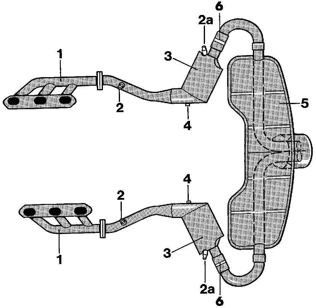 In the case of USA vehicles, two oxygen sensors (2a) required for testing the efficiency of the catalytic converters are also installed between the catalytic converters and end muffler.