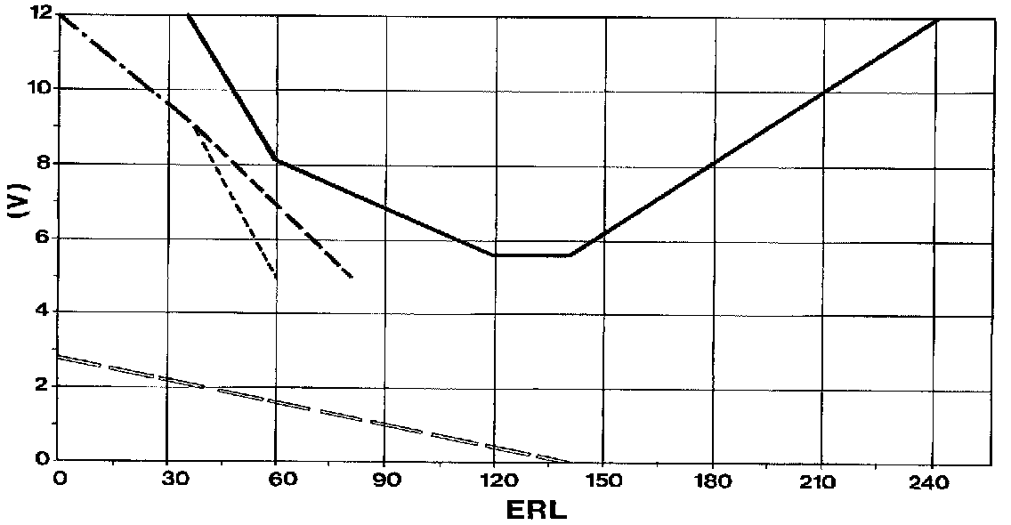 Depending on the Energy Requirement Level (ERL) condition signal, the airflow is adjusted under program control by regulating the voltage supplied to the fresh-air blower. Appropriate characteristics exist for both automatic mode and manually selected air distribution.Diagram for blower voltage in automatic mode