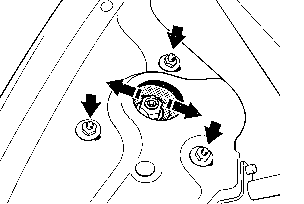 The camber is adjusted by moving the spring strut transversely. For this purpose, loosen the three fastening nuts on the spring-strut mount and, for the purpose of displacement, remove the covering cap on the piston rod.