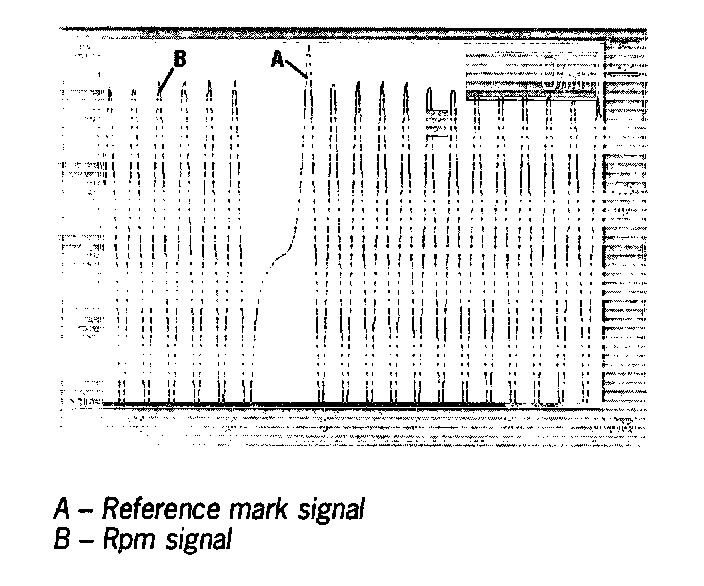Start engine. A sinusoidal trace must be visible on the screen. A briefly higher amplitude identifies the reference mark signal.