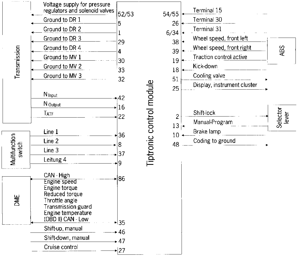 The signals between the DME and Tiptronic are exchanged via CAN-BUS* lines, i.e. data blocks are transferred via two lines.